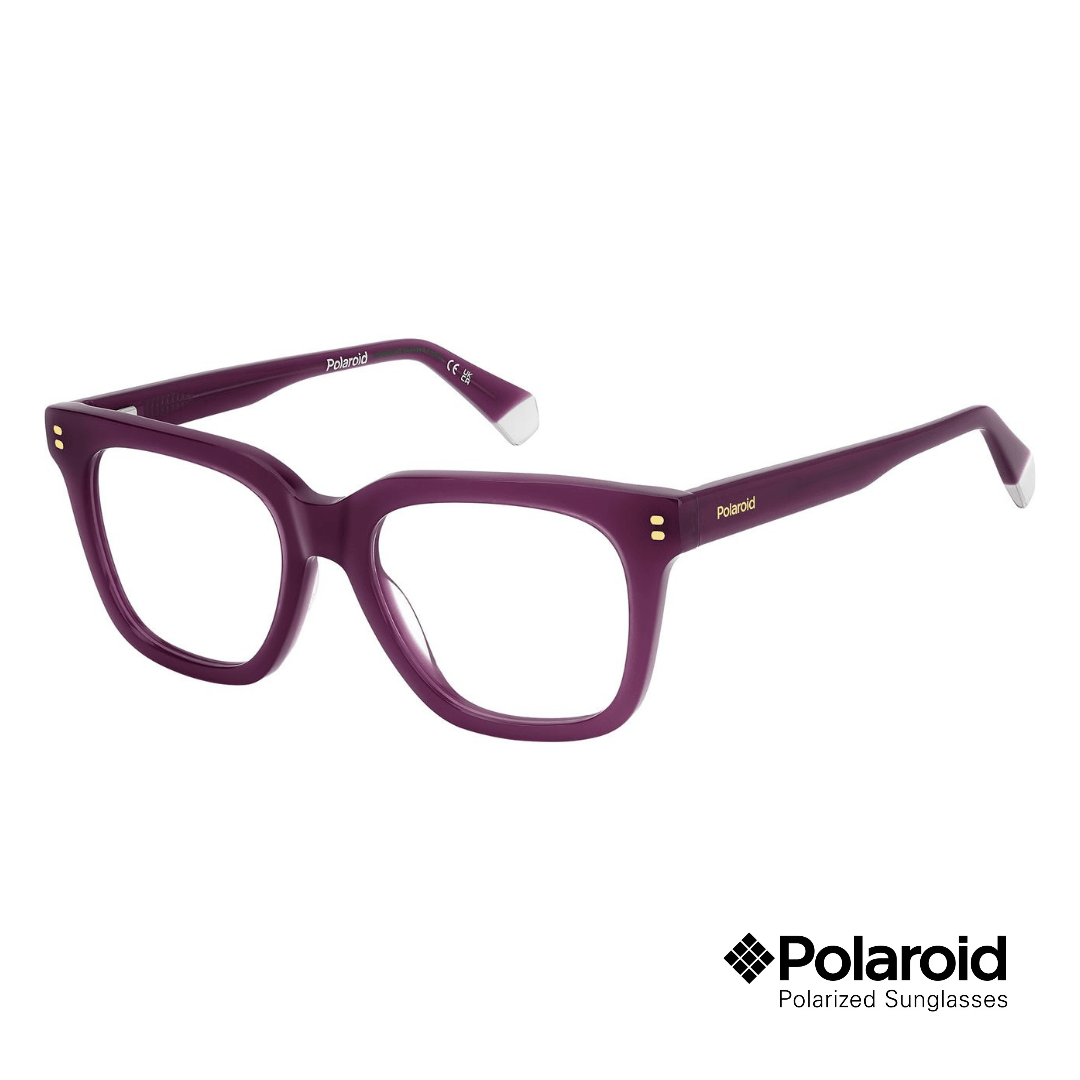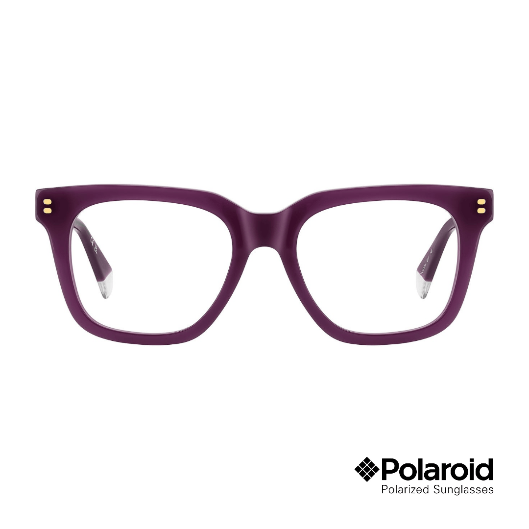 Armazón oftálmico Polaroid de diseño cuadrado en color morado, ideal para un estilo moderno y sofisticado. Fabricado en acetato, ofrece ligereza y comodidad para el uso diario, combinando elegancia con un look contemporáneo.